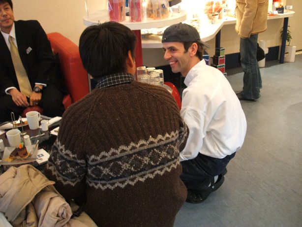 このイベントの打ち合わせの一環で、イギリスの伝統的お菓子を大阪で広めているケーキ屋さん、「ブロードハースツ」のピーター・ジョン・ブロードハースト氏と、(財)大阪市教育会館の方々とおせわになってる(株)ワールドオフィスのK氏とボクの奥さん(ボクの怠慢管理とアシスタント)とで打ち合わせの通訳をしたのです。