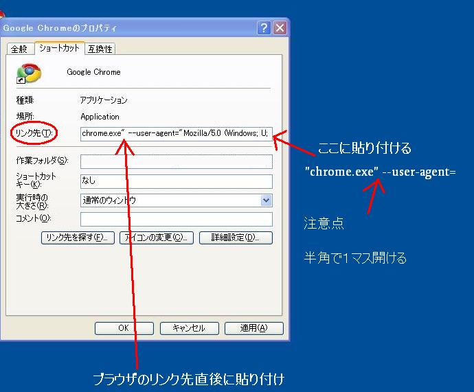 4,注意点はchrome.exe"の後ろは半角で1マスのスペースをあけ、その直後に--user-agent="Mozilla---------------となるように貼り付ける。