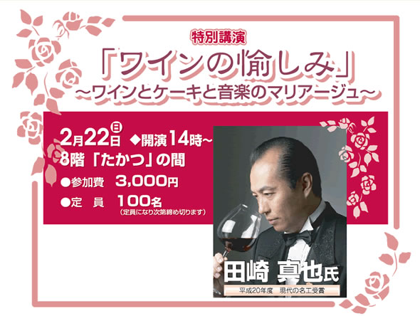イベント当日はかの有名な「世界最優秀ソムリエコンクール優勝」された、田崎真也さん(http://www.tasaki-shinya.com/)ワイン講座がメインで開かれます。募集100人限定イベントです。